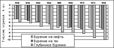 За период с 1940 по 1980 г. глубин а разведочных и эксплуационных скважин на нефть и газ возросла в 1.5-2.5 раза (см. рис.1) Предполагается вскрытие залежей нефти на глубинах до 8000 м, природного газа - до 12000 м. Предполагается нахождение нефти и газа на глубинах до 24000 м. Основные затраты на сооружение скважины приходятся на бурение (примерно 60 % времени и 73 % затрат). Разрушение горных пород осуществляется, чаще всего, при помощи долот. Вращение долоту сообщается от привода при помощи бурильной колонны В зависимости от расположения привода различают роторное бурение и бурение с помощью забойных двигателей. Компоновка бурильной колонны при роторном бурении приведена на рис.2