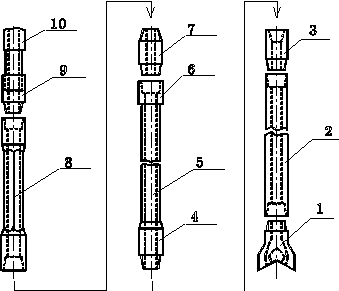 1 — долото; 2 — утяжеленные бурильные трубы; 3, 7, 9 — переходники; 4, 6 — замки; 5 — бурильные трубы; 8 — ведущая бурильная труба; 10 — вертлюг. Рис.2 Компоновка бурильной колонны при роторном бурении. Для изоляции вскрытых пластов, предотвращения перетока жидкости или газа из одного горизонта в другой, обрушения стенок скважины закрепляют обсадными колоннами, составленными из обсадных труб Размеры (диаметр, толщина стенки) обсадных труб, прочностные характеристики их материала выбирают в зависимости от физико-механических свойств пород, состава рабочей среды и глубины скважины. На рис. 3 видно использование обсадных труб при оборудовании скважины. Показано устройство скважины с колоннами, состоящими из различных видов обсадных труб. По назначению колонны разделяют на направление, кондуктор, техническую колонну, эксплуатационную колонну обсадных труб.