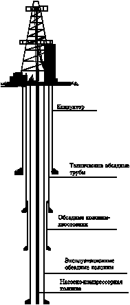 Рис. 3 Устройство эксплуатационной скважины После спуска обсадные колонны цементируются путем нагнетания в них цементного раствора и продавливания его в затрубное пространство между стенкой скважины и обсадными трубами. Цементирование предохраняет трубы от разрушения и снижает вероятность нежелательных явлений в скважине. В законченную скважину опускают насосно-компрессорные трубы, над устьем устанавливают запорную арматуру, путем закачки воды или нагнетания воздуха из скважины удаляют промывочный раствор, скважина вступает в стадию эксплуатации. На всех стадиях строительства и эксплуатации скважин используют трубы нефтяного сортамента стоимость которых в общей стоимости оборудования скважины составляет около 60 %.В процессе эксплуатации трубы подвержены воздействию сложных нагрузок. Величина и характер зависят от назначения труб, глубины скважины, способа бурения и эксплуатации. В наиболее сложных условиях работают бурильные трубы. действие осевых нагрузок, центробежных сил и крутящего момента вызывает изгиб колонны, который усугубляется искривлением скважины из-за разной буримости пород. При вращении изогнутой колонны возникают знакопеременные изгибающие усилия. Дополнительные знакопеременные нагрузки возникают в результате пульсации промывочной жидкости, вибрации инструмента, особенно при разбуривании крепких пород. При знакопеременных нагрузках очень сильно влияют концентраторы напряжений, изменяя форму и нарушая сплошность поверхности (резьба, дефекты, поверхности). В большинстве случаев усталостное разрушение бурильных колонн происходит в интервале 500-1200 м, т.е. в зонах интенсивного искривления ствола скважин. Усталостное разрушение резьбовых соединений характерно также для утяжеленных и ведущих бурильных труб. Соединение этих труб имеет меньшую площадь поперечного сечения, чем тело трубы, т.е. менее жесткое и, кроме того, сильный концентратор напряжения - резьбу. Бурильные трубы работают в агрессивной среде промывочного раствора, что также способствует снижению усталостной прочности труб циркуляция промывочного раствора внутри бурильной колонны вызывает промыв резьбового соединения или тела трубы. В резьбовом соединении промыв происходит или по винтовой линии, или по образующей конуса резьбы. Способствуют промыву неточности изготовления соединения, приводящие к увеличению зазоров. Обсадные трубы подвержены воздействию статических нагрузок, дополнительных нагрузок динамического характера, возникающих при при спуске колонн (при расхаживании колонн в случае прихвата, при резком торможении), нагрузок, возникающих в процессе цементирования при схватывании цементного раствора. При перекрытии соленосных горизонтов возникают дополнительные изгибающие усилия от их сжатия. В результате действия перечисленных нагрузок возможны повреждения обсадных колонн – потеря герметичности соединения, их разобщение, разрушение от внутреннего давления и т.д. Воздействие агрессивных сред приводит к коррозионному разрушению. Действие осевых растягивающих нагрузок приводит к нарушению герметичности, к разобщению соединений. Этому способствуют дополнительные изгибающие усилия. Например, при креплении наклонных скважин по мере увеличения интенсивности их искривления вероятность нарушений в 
