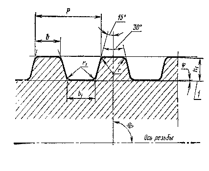 Примечания к табл.1: 1) отклонения по шагу резьбы на длине, не превышающей 25.4 мм, допускаются для расстояния между любыми двумя витками полной резьбы; при расстоянии между витками более 25.4 мм допускается увеличение отклонений пропорционально увеличению расстояния, но не свыше указанных в таблице для всей длины резьбы; 2) предельные отклонения по половине угла профиля относятся к углу между стороной профиля и перпендикуляром к оси резьбы трубы и муфты; 3) отклонения по конусности относятся к среднему диаметру резьбы трубы и муфты, а также к наружному диаметру резьбы трубы и внутреннему диаметру резьбы муфты. 4) размеры и допуски, отмеченные *), задаются для проектирования и изготовления инструмента Параметры трапецеиадальной резьбы приведены на рисунке 2 и в таблице 2.